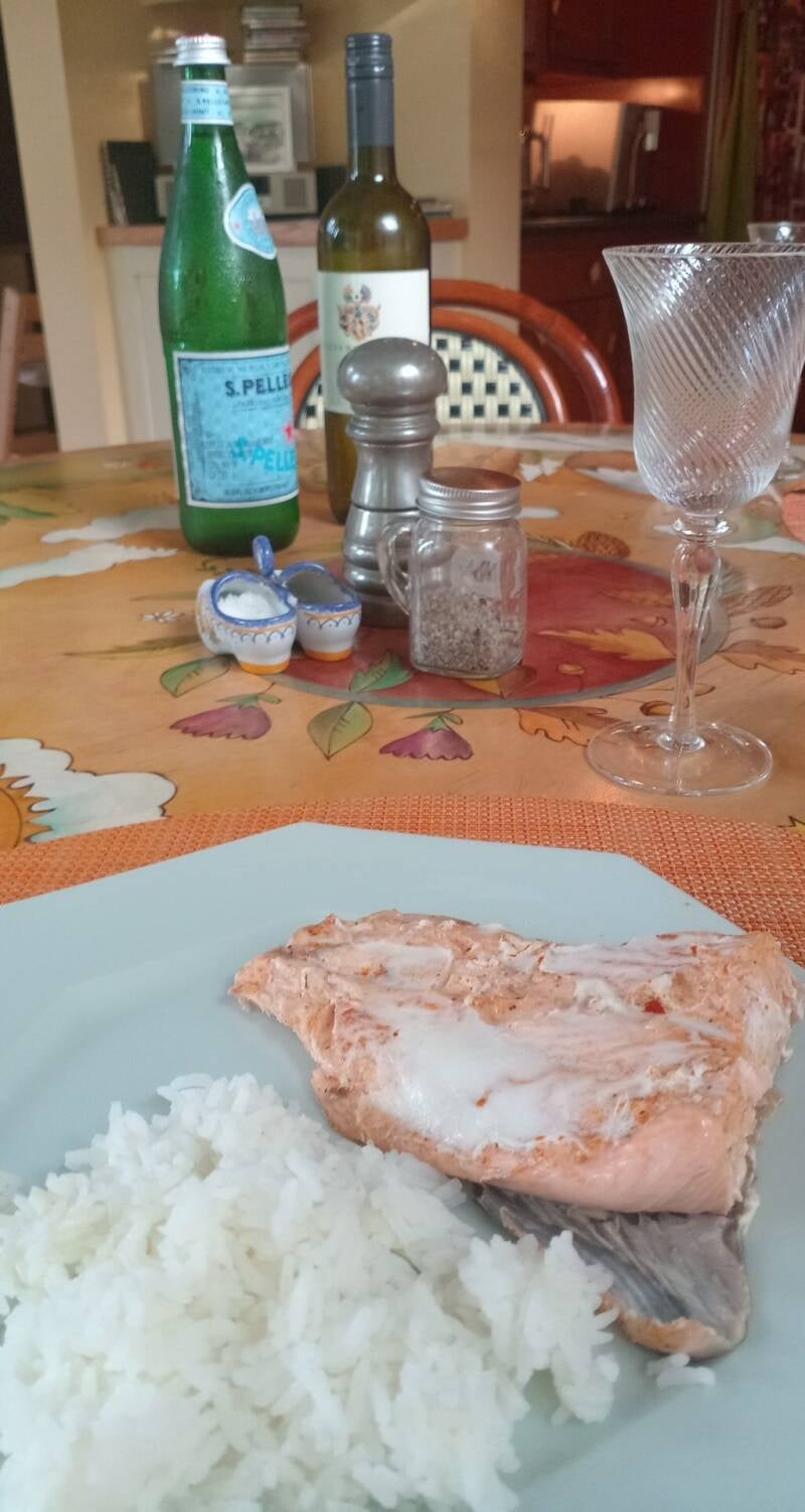 My sponsor William made a dinner for the two of us before he flew to France, we had salmon with rice and vegetables. Also, a glass of wine.. or two haha!